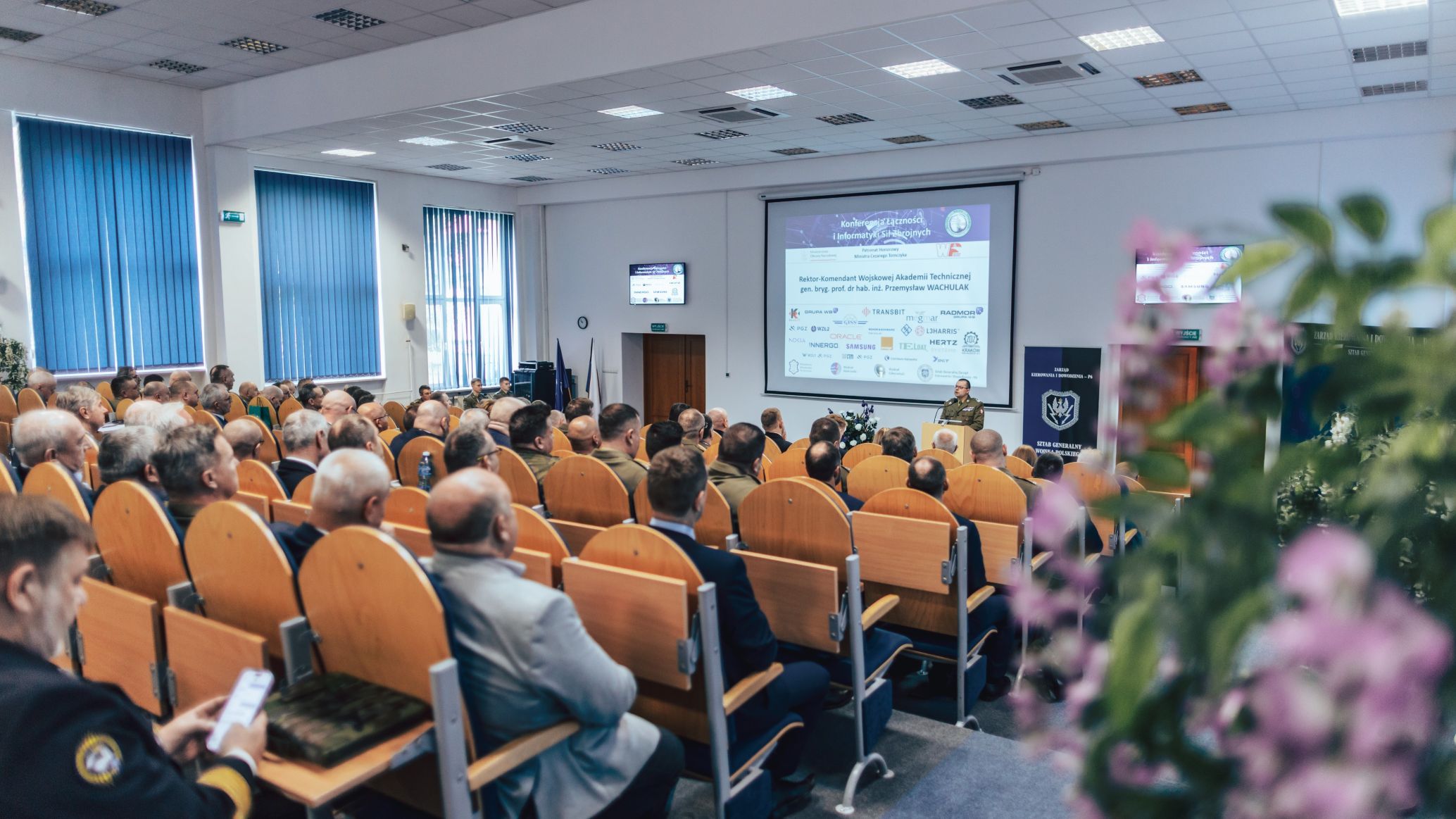 „Spotyka się środowisko decydenckie z naukowym i producenckim – gdzie rodzą się innowacje, pomysły i produkty. Mamy wiele punktów wspólnych, a kierunki, które się przenikają stanowią o owocach pracy personelu Centrum Szkolenia Łączności i Informatyki” – dodał jako współgospodarz wydarzenia Komendant CSŁiŁ płk Paweł Nowotnik, w imieniu swoim i gen. bryg. Krzysztofa Stańczyka. Kształcenie kadr na potrzeby MON w Wydziałach Elektroniki (WEL) i Cybernetyki (WCY) WAT przedstawili: Prodziekan ds. kształcenia WEL dr inż. Wiktor Olchowik oraz Prodziekan ds. kształcenia i rozwoju WCY dr inż. Dariusz Pierzchała, prof. WAT.