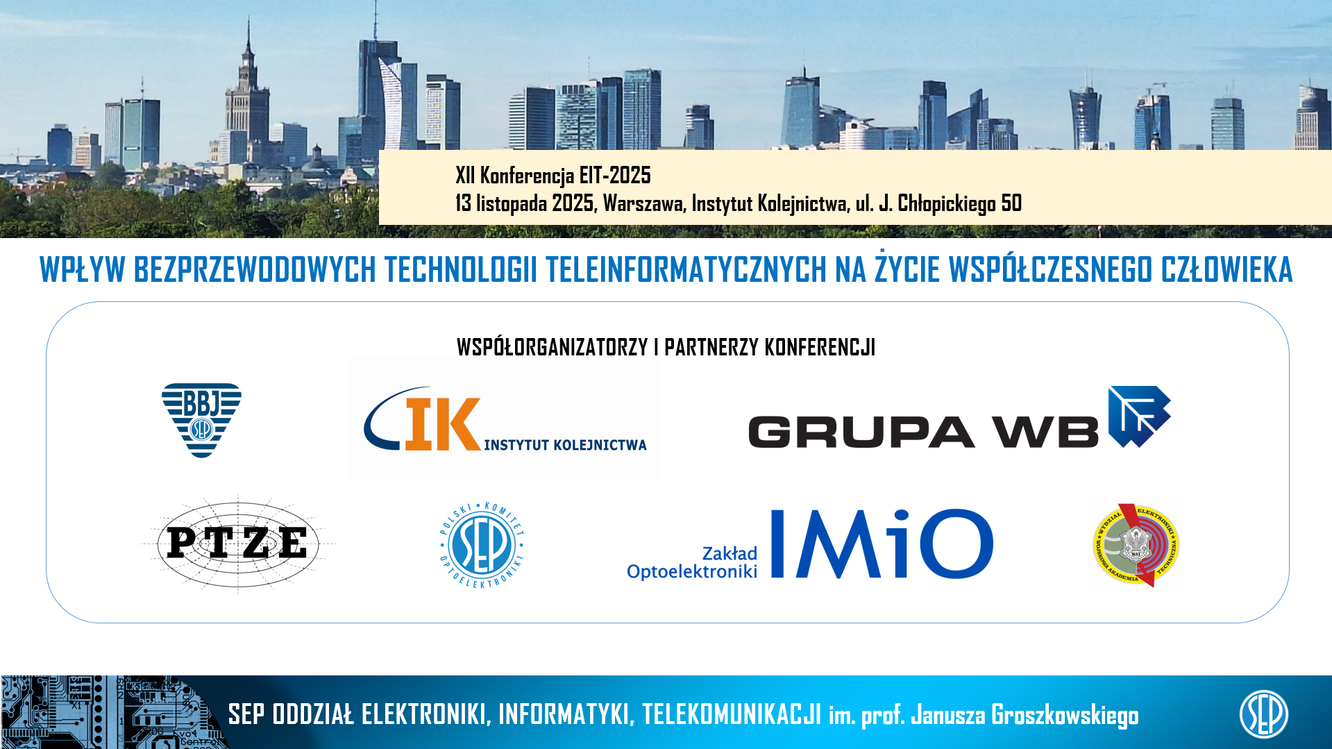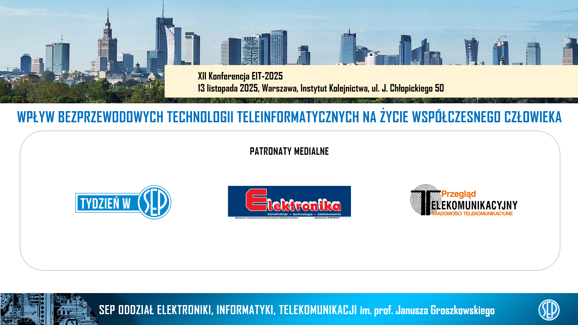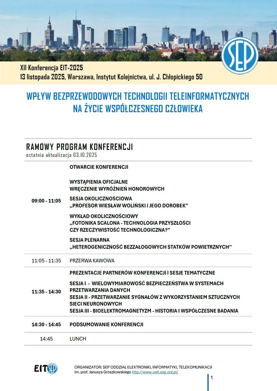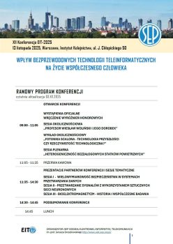 Oddział Elektroniki, Informatyki, Telekomunikacji SEP im. prof. Janusza Groszkowskiego zaprasza na XII KONFERENCJĘ EIT-2025 z cyklu „Wpływ bezprzewodowych technologii teleinformatycznych na życie współczesnego człowieka”. Konferencja odbędzie się 13 listopada 2025 r. w Warszawie – Instytut Kolejnictwa, ul. J. Chłopickiego 50. Partnerem konferencji jest Wydział Elektroniki WAT.