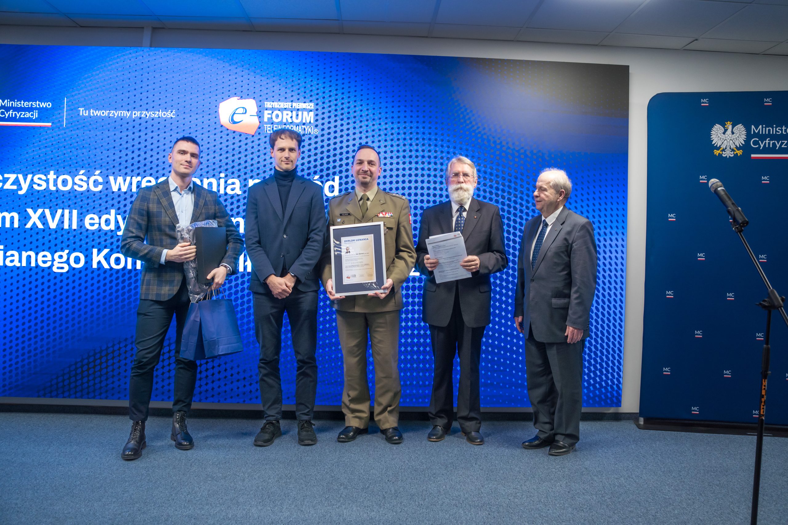 Wśród nagrodzonych autorów są absolwenci i doktoranci naszego Wydziału – por. mgr inż. Rafał Szczepanik oraz kpt mgr inż. Tomasz Walczyna. Uzyskali oni nagrodę specjalną w kategorii: Najlepsza praca internetu rzeczy i sztucznej inteligencji za projekt „Bezzałogowy System Powietrzny Rozpoznania i Ataku Sieci Radiowych HackBee”. Głównym Partnerem tej kategorii był Phoenix Systems Sp. z o.o.. Opiekunami merytorycznymi wyróżnionych są płk dr hab. inż. Jan M. Kelner, prof. WAT oraz dr inż. Paweł Skokowski.